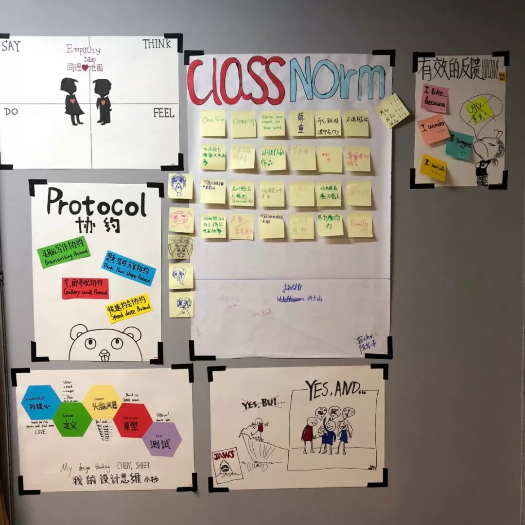 艺廊参观协约(Gallery Walk Protocol):将作品像“画廊”展出一样挂起,同学们走动参观并且在便签纸上留下书面反馈,这是一个无声协议,是为了解决滔滔不绝的优质反馈过后,最后却不能留下什么。老师带着谷粒们对反馈内容做了对焦:只有详细的、建设性的意见,才是好的意见。要使用这样的语言和句式:
